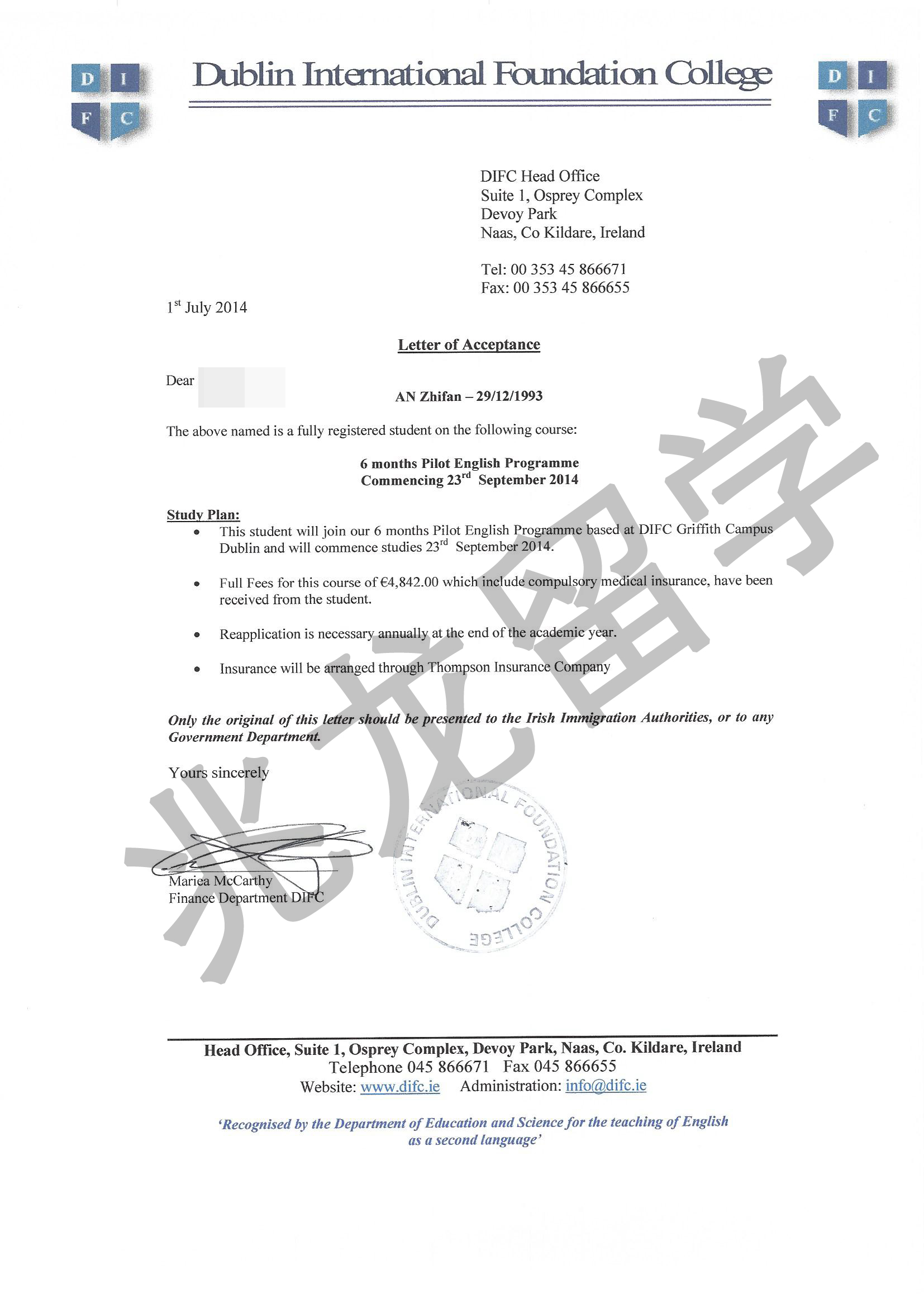经过兆龙留学爱尔兰留学签证网老师的努力,成功为安同学申请到都柏林国际预科学院的录取offer录取,以下是他的offer分享,在此祝他留学之路一切顺利!