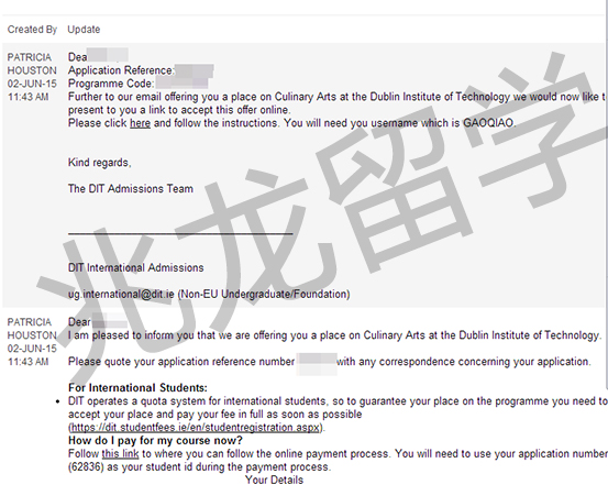 经过兆龙留学爱尔兰留学签证网老师的努力,成功为高同学申请到爱尔兰都柏林理工学院录取OFFER,以下是他的offer分享,在此祝他留学之路一切顺利!
