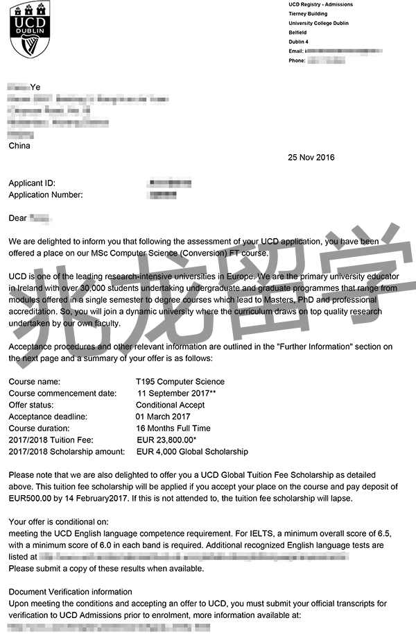 经过兆龙留学-爱尔兰留学签证网老师的努力,成功为叶同学申请到爱尔兰都柏林大学计算机科学硕士OFFER并获得4000欧元奖学金,以下是他的offer分享,在此祝他留学之路一切顺利!更多爱尔兰留学申请及爱尔兰签证问题请拨打咨询热线400-666-2249。