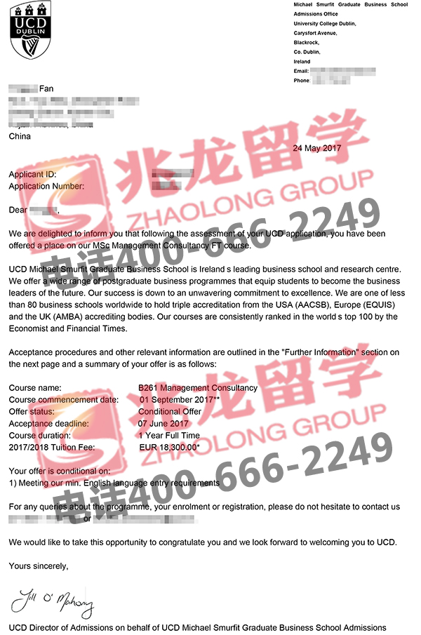 经过兆龙留学-爱尔兰留学签证网老师的努力,成功为范同学申请到爱尔兰都柏林大学管理咨询专业录取OFFER,以下是他的offer分享,在此祝他留学之路一切顺利!更多爱尔兰留学申请及爱尔兰签证问题请拨打咨询热线400-666-2249。
