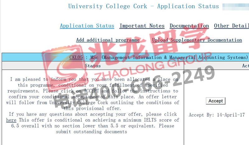 经过兆龙留学-爱尔兰留学签证网老师的努力,成功为吴同学申请到科克大学管理信息与管理会计系统专业录取通知书,以下是他的offer分享,在此祝他留学之路一切顺利!更多爱尔兰留学申请及爱尔兰签证问题请拨打咨询热线400-666-2249。