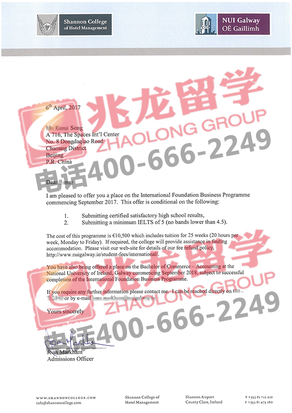 经过兆龙留学-爱尔兰留学签证网老师的努力,成功为宋同学申请到香侬酒店管理国际商科预科课程业Offer,以下是他的offer分享,在此祝他留学之路一切顺利!更多爱尔兰留学申请及爱尔兰签证问题请拨打咨询热线400-666-2249。