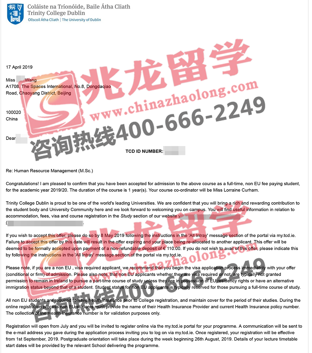 经过兆龙留学-爱尔兰留学签证网老师的努力,成功为王同学申请到爱尔兰圣三一大学人力资源管理专业硕士offer,以下是学生offer分享,在此祝他留学之路一切顺利!更多爱尔兰留学申请及爱尔兰签证问题请拨打咨询热线400-666-2249。