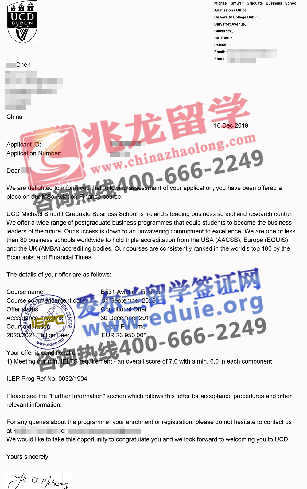 经过兆龙留学-爱尔兰留学签证网老师的努力,成功为陈同学申请到爱尔兰都柏林大学UCD航空金融专业硕士offer,祝他在都柏林大学能获得更好的提升。以下是学生offer分享,更多爱尔兰留学申请及签证问题请拨打兆龙留学免费咨询热线400-666-2249。