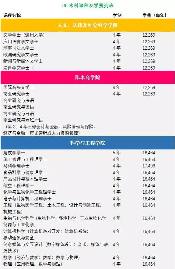 此外,UL的本科课程性价比也非常之高哦,跟随兆龙留学-爱尔兰留学签证网小编一起来瞧瞧2020年入学的各本科专业学费情况吧: