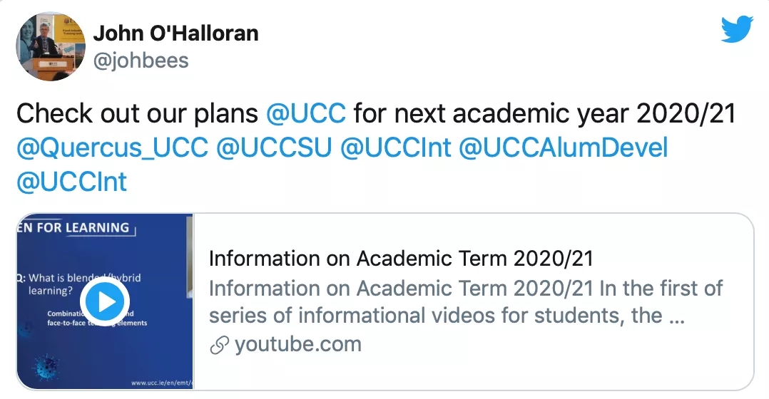 科克大学(UCC)的副校长和教务长John O'Halloran教授表示,“这将是一个不同的学年,“尽管如此,UCC对疫情的爆发做出了出色的反应,并且我想确保新学年所有即将入学的学生,无论他们是回到还是第一次来UCC,都将拥有一段完美的学习体验,”对于绝大多数UCC学生而言,该学期将于9月28日星期一开始。即将到来的学年也将是一次“混合学习经历”,它将结合网课和面授的形式。