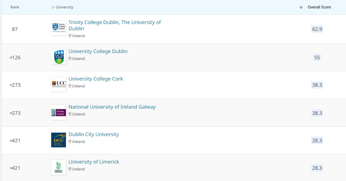 在2025年QS世界大学排名中,都柏林圣三一大学排名稳中有升居世界第87,稳居爱尔兰第一。