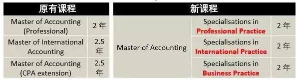 全部统一为Master of Accounting, 但是有三个专业选择方向:International Practice、Professional Practice、Business Practice;