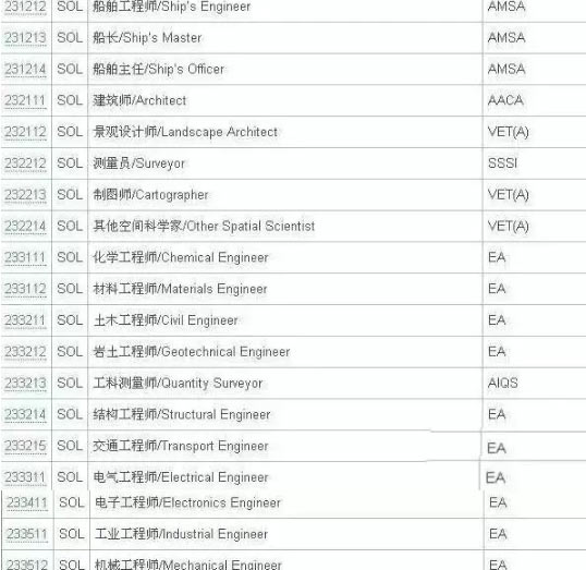 2016-2017年澳大利亚独立技术移民SOL职业列表