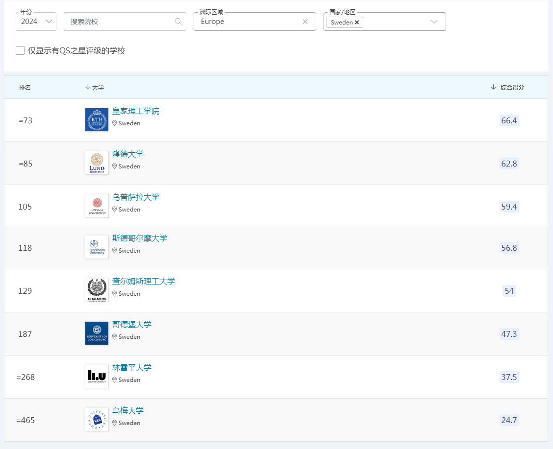 本次QS排名瑞典学校普遍上升,瑞典6所高校入围前200,KTH皇家理工学院排名73,瑞典排名第1位。其中涨幅较大的有乌普萨拉大学进步23位至105名,斯德哥尔摩大学进步35位至118名,林雪平大学进步52位至268名。