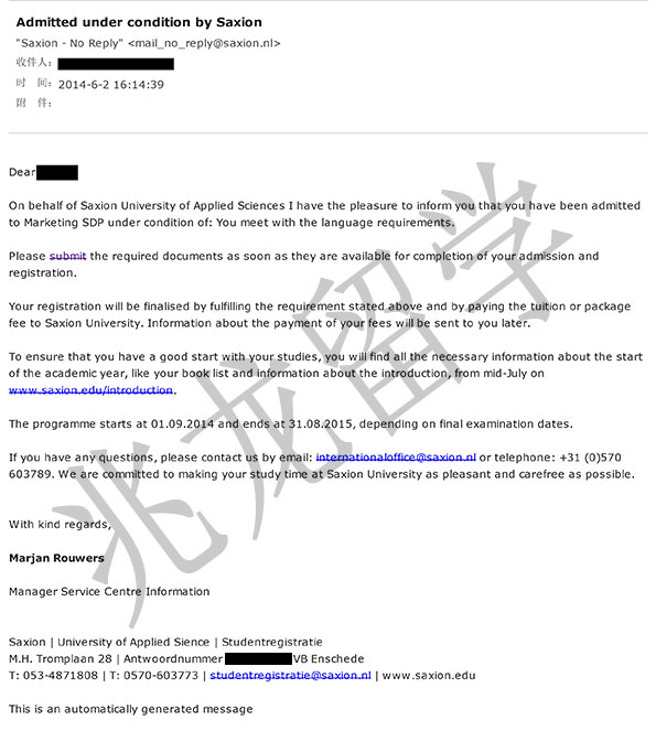 经过兆龙留学老师的努力,成功为张同学申请到荷兰撒克逊大学的有条件录取,以下是他的offer分享,在此祝他留学之路一切顺利!