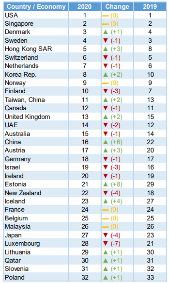 荷兰的排名稍低是因为这三个类别的排名都有所下降。根据这份报告,城市管理,数字/技术技能的可获得性以及教育方面的公共总支出导致知识类别的下降,而移民法律的有效性和银行、金融服务的效率下降导致技术得分较低;最后,在未来准备类别下,电子参与、公司的敏捷性以及对大数据和分析的使用都有所下降。