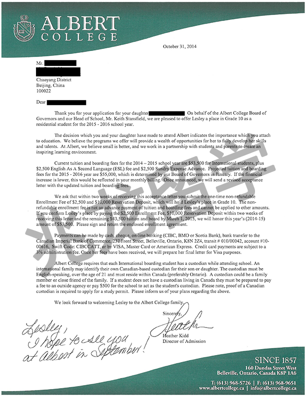 李同学2014年8月20日通过朋友介绍,来北京兆龙留学进行咨询,兆龙留学美加部的老师通过与孩子沟通了解到孩子的平时成绩很优秀,但是语言不自信,老师给她做了内测后,做出了个性话的学习规划,因为李同学不满15周岁所以只要考托福就可以了,孩子和妈妈对加拿大的贵族中学有所了解,而且只定了国王艾吉尔中学,匹克林学院,阿尔伯塔学院这三所学校,不考虑别的加拿大学校。但是申请加拿大的顶级高中光有优秀的成绩是不够的,在兆龙咨询团队的帮助下,正式开始了留学规划及语言培训,首先是语言的培训,学生的基础不错只是对考试不是很了解,通过两个月的培训李同学成功考到了860分的成绩,满分900。接下来就是面试培训,包括自我介绍,性格,成长经历等,在为期两周的面试培训后,Y李同学在兆龙留学老师的陪伴下,在兆龙留学中心通过SKP跟加拿大的三所学校分别面试,两周后开始接到匹克林学院的Offer,第三周国王艾吉尔中学,阿尔伯塔学院的Offer也如期而至。以下是李同学的视频面试照片和offer展示。