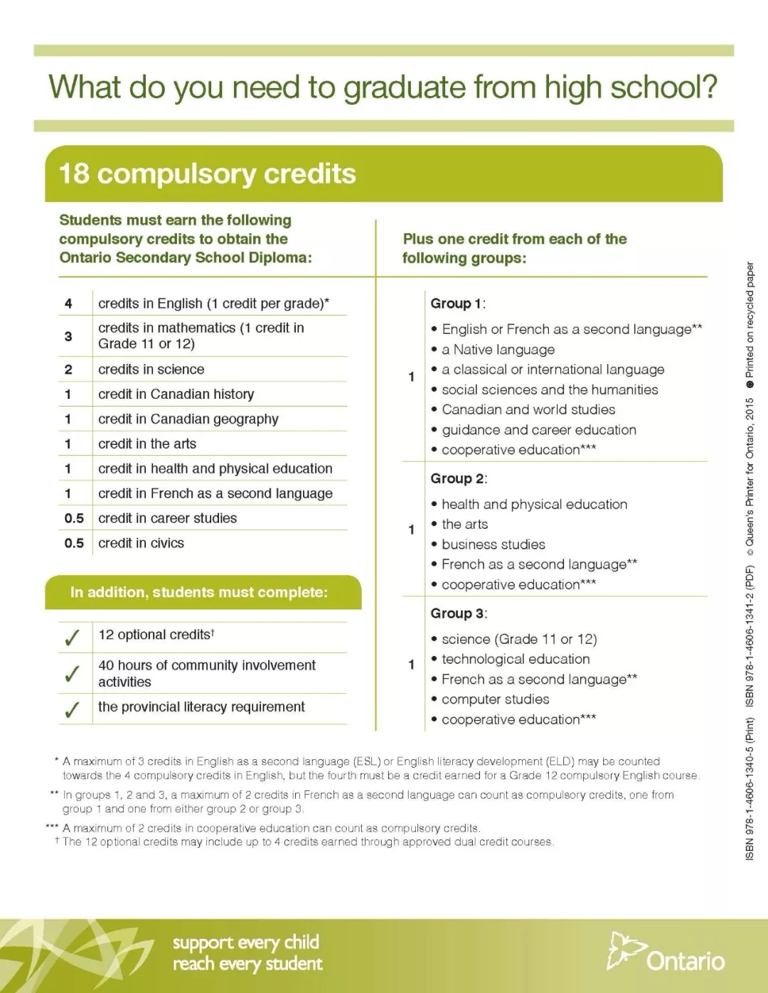 a. 安大略省实行学分制,学生要获得安省的高中毕业文凭(OSSD),需要:完成30个高中阶段学分(课程),包括:必修学分18个,选修学分12个。