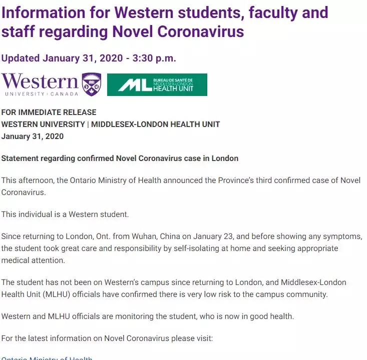西安大略大学校方已经发出通知说明,患者为该校学生,但她从中国返回后并没有回到校园,在校学校不用恐慌,校园的风险非常低!