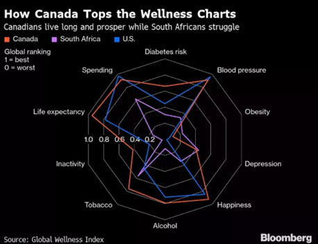 健康指数依据是血压、平均寿命、政府保健投入、抑郁症比例、吸烟率、运动率等方面,加拿大都是标杆。