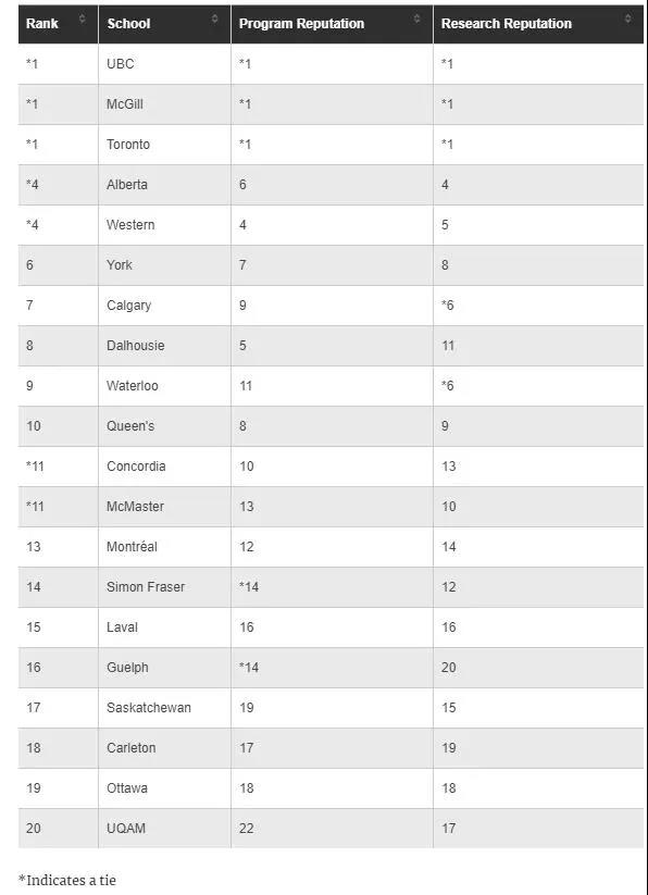 阿尔伯塔大学、皇后大学以及西安大略大学并列第4名。