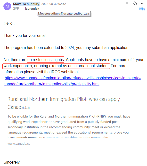 收到移民局最新关于RNIP 计划延期的好消息后,我们劳伦森Team 马不停蹄给萨德伯里市政府写了邮件确认,并得到肯定答复!!