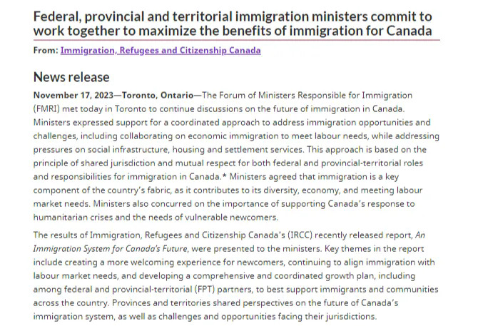 此前,加拿大移民局发布了一份报告,主题是为新移民制定一项全面的增长计划,包括完善加拿大联邦和省/地区(Federal and Provincial-Territorial,简称FPT)合作机制。