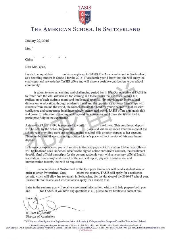 在农历小年来临之际,瑞士美国中学(TASIS—The American School In)的offer无疑是乔同学最好的小年贺礼!乔同学2015年十月参加了兆龙独家举办的中国最权威的北美寄宿中学联展。该生多才多艺、英语口语和听力俱佳,在展会上给学校招生官留下了深刻的印象。会后,学生家长与兆龙留学陈荣老师、王冬梅老师多次沟通,细致制作该生的申请材料,今天喜获瑞士美国学校offer!