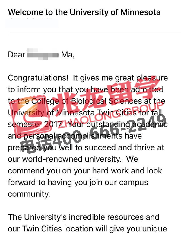 经过兆龙留学美国部老师的努力,成功为马同学申请到美国明尼苏达大学双城校区offer,以下是他的offer分享,在此祝他留学之路一切顺利!更多美国大学申请及美国签证问题请拨打咨询热线400-666-2249!