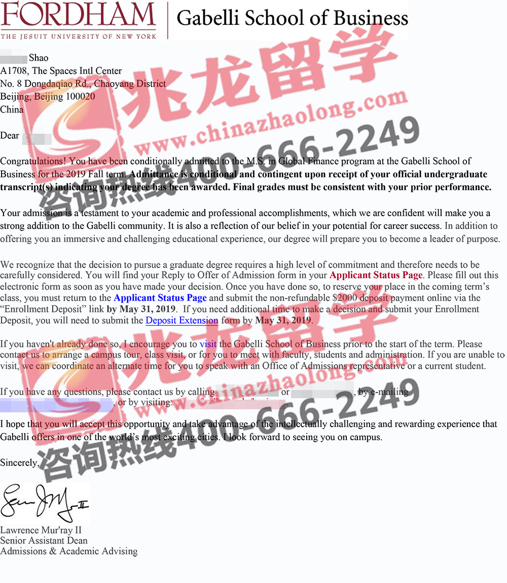 经过兆龙留学美国部老师的努力,成功为S同学申请到美国福德汉姆大学全球金融硕士offer,相信福德汉姆大学将会带给你很多美国留学的美好回忆。祝S同学在福德汉姆大学能获得更好的提升,在此祝他留学之路一切顺利!