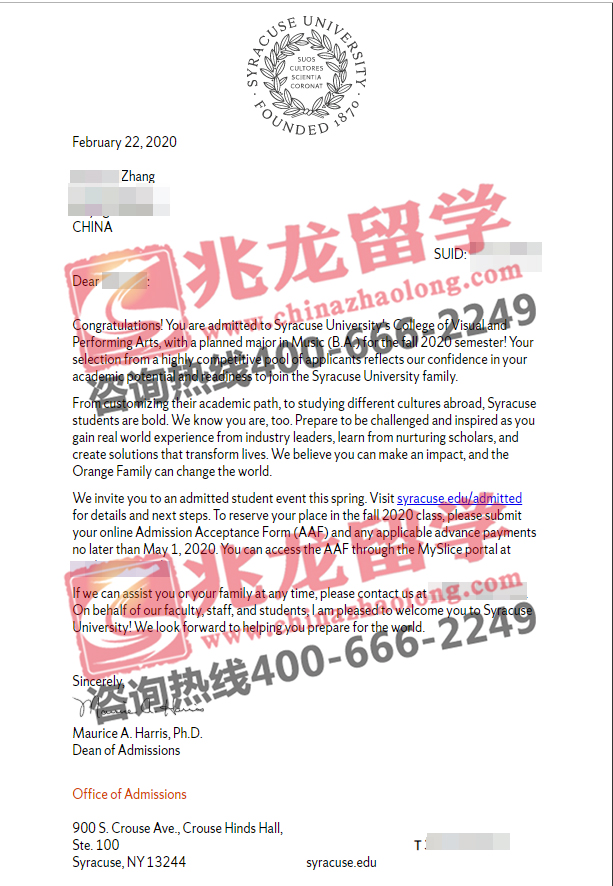恭喜兆龙留学成功为张同学获得美国综合排名54位的雪城大学音乐专业本科offer!