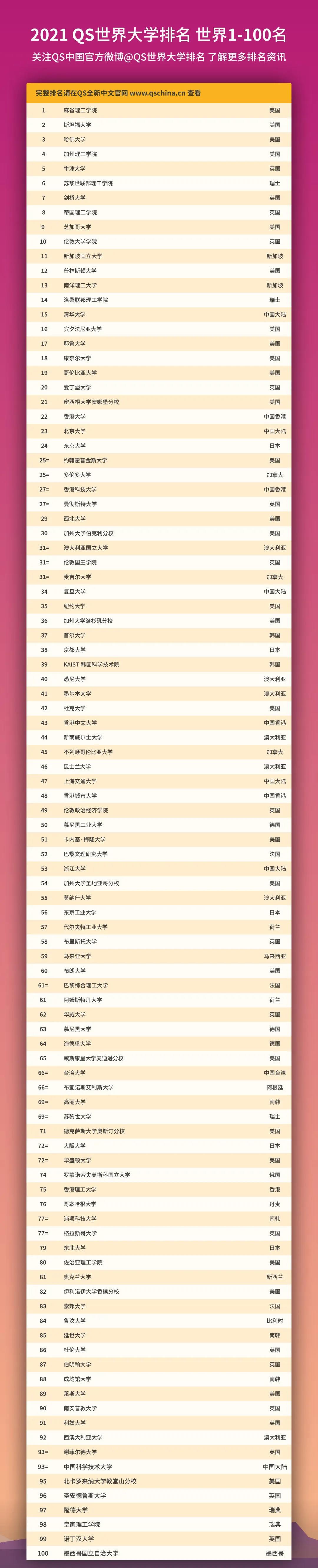 2021最新QS世界大学排名出炉了!北京时间6月10日,英国教育组织QS(Quacquarelli Symonds)发布2021年QS世界大学专业排名(QS World University Rankings by Subject 2021)。接下来,兆龙留学小编和大学分享一下QS世界大学排名中美国大学的最新排名,有意向到美国留学的小伙伴快一起来看看吧!