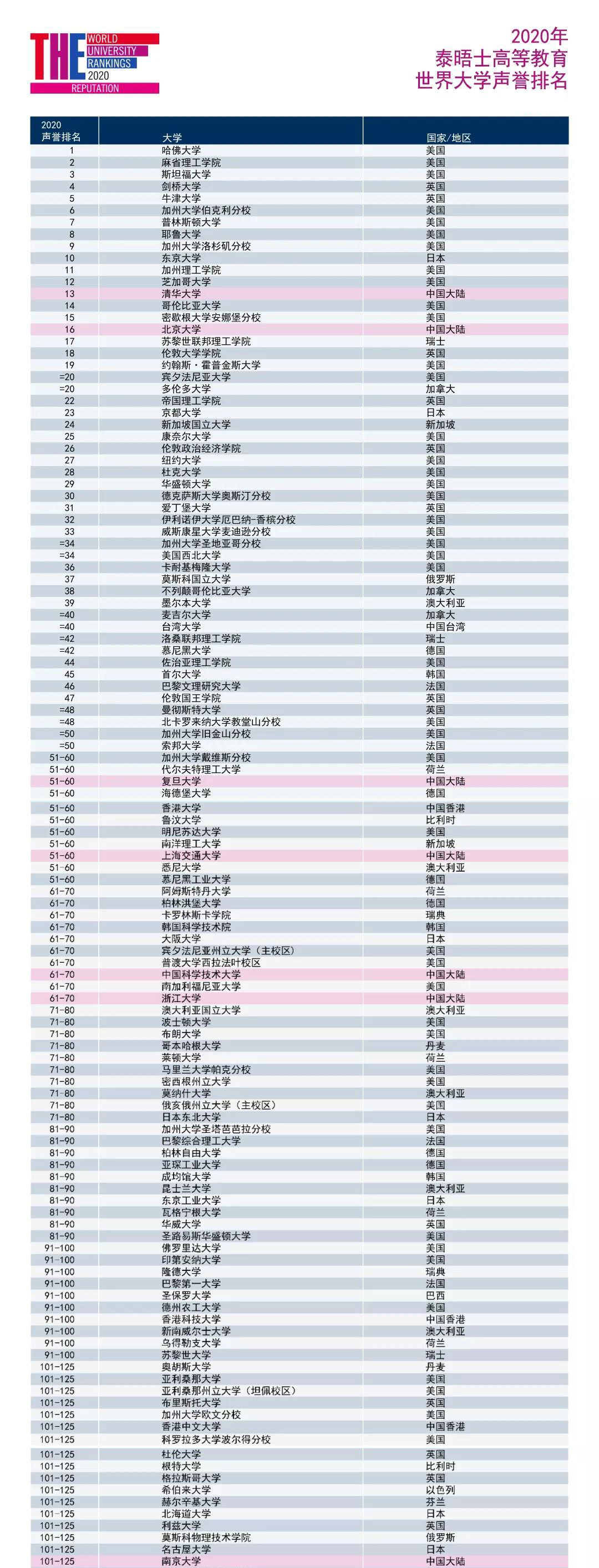 泰晤士高等教育发布了2020年的世界大学声誉排名。