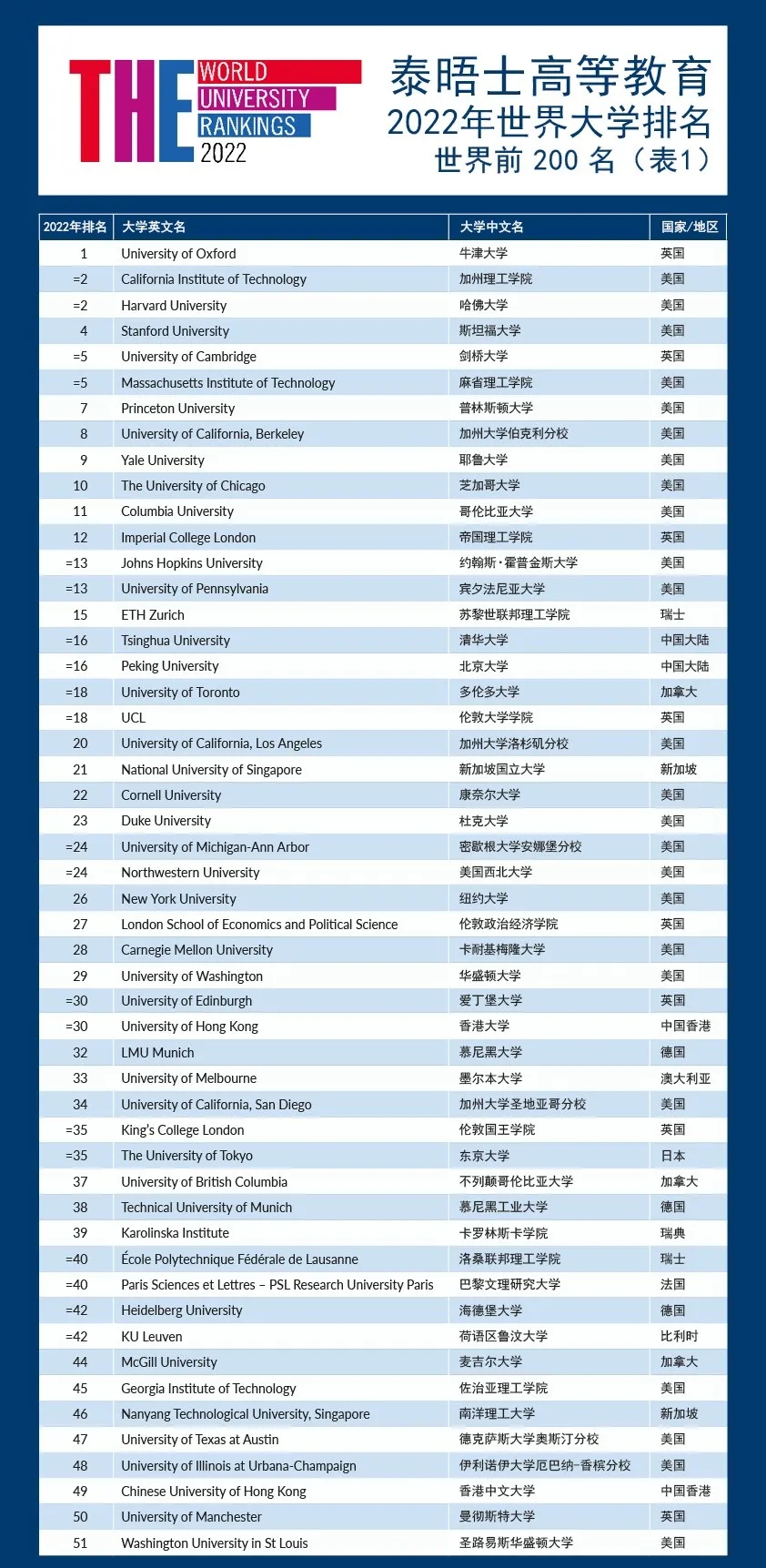 2022年度THE世界大学排名TOP200