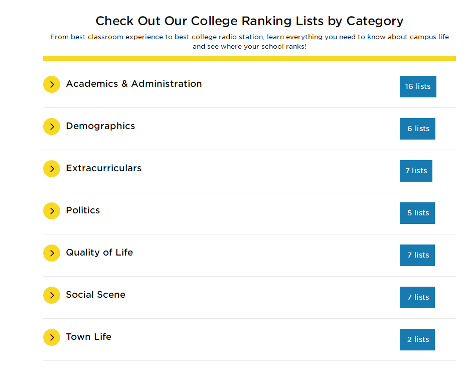 不同于大家熟知的 U.S.News、QS、THE、ARWU等在进行院校排名时更为注重学校学术声誉等,The Princeton Review《普林斯顿评论》更关注学生本身在校读书的体验和校园生活的实际感受,也就是用户体验,榜单排名依据学生的反馈更接近美国学生眼中的“最佳大学”,类似于在学生心目中美国的大学的“大众点评”。