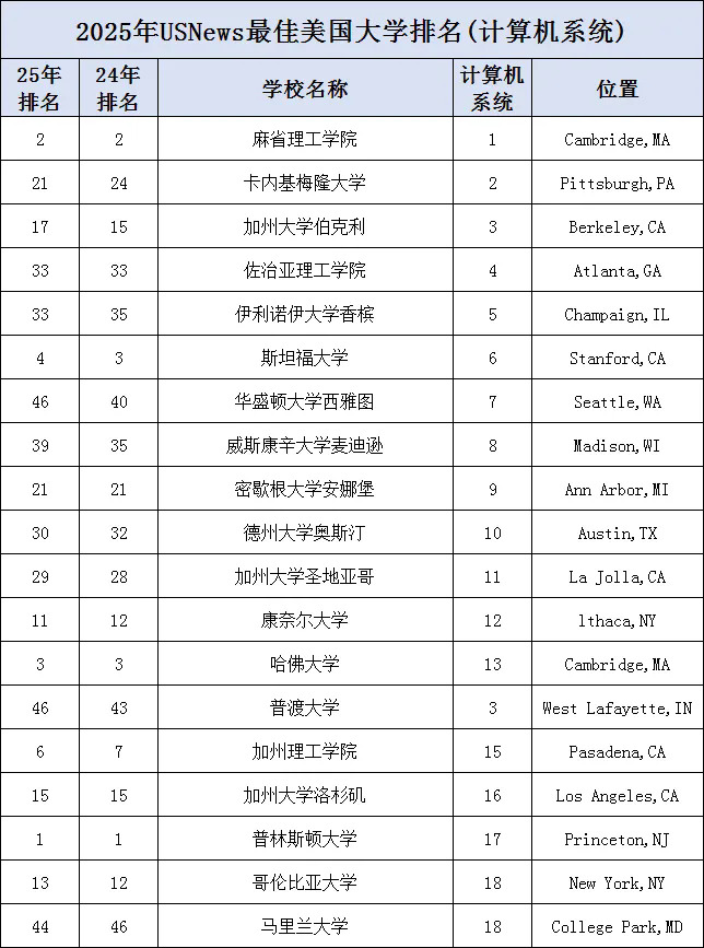 2025年U.S.News CS专业最强TOP30学校