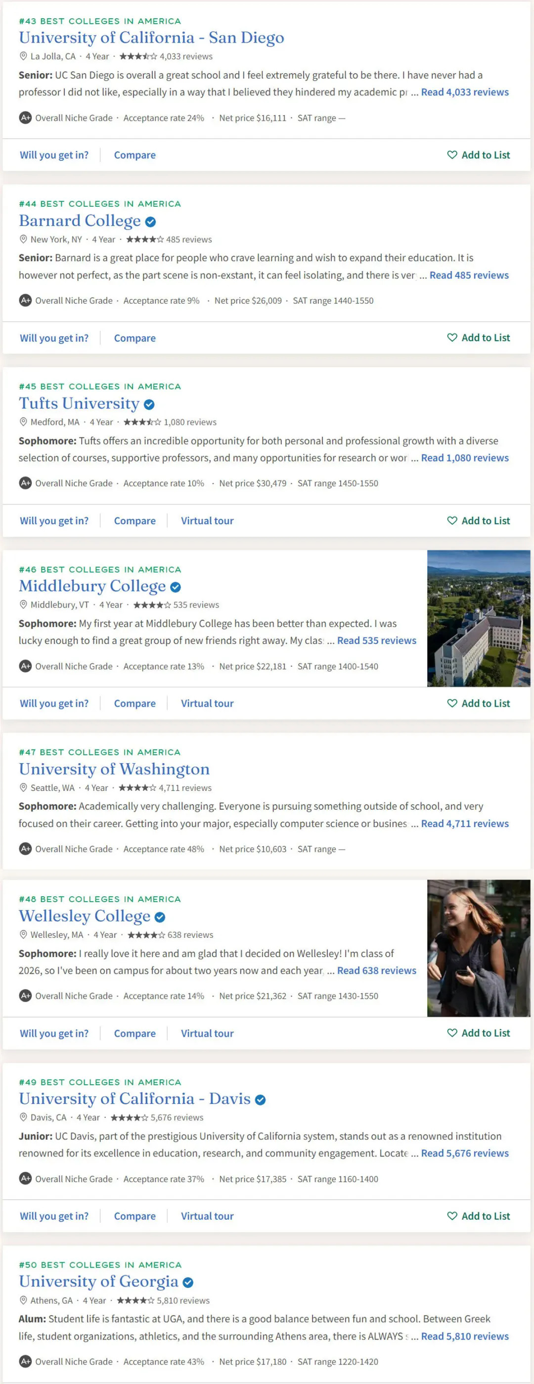 UC系统向来是国内同学申请的热门选择,UCLA(洛杉矶分校)和UCB(伯克利分校)这两位大哥总是在争谁才是UC第一,不过在Niche的排名中,UCLA(第16名)把UCB远远甩在了身后(第35名)。UCI(欧文分校)、UCSD(圣地亚哥分校)、UCD(戴维斯分校)也进入Top 50。