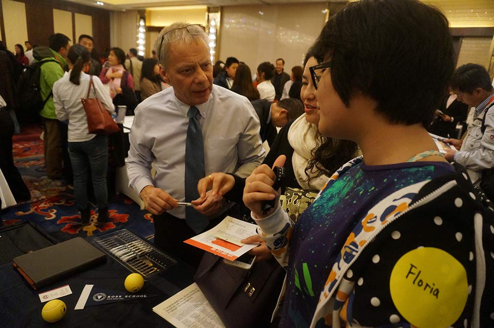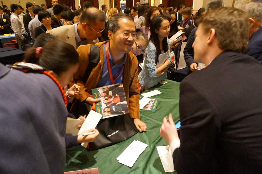 展会刚开始,来自美国马里兰州的圣提摩西中学、缅因州的肯特希尔中学和华盛顿中学及宾夕法尼亚州的怀俄明神学院的大学预科学校等多所前就排起了长队。展会上,很多学生排着长队踊跃的与各学校招生官沟通交流,询问学校的情况,场面火爆,大家都想争取与学校招生老师的交流机会。