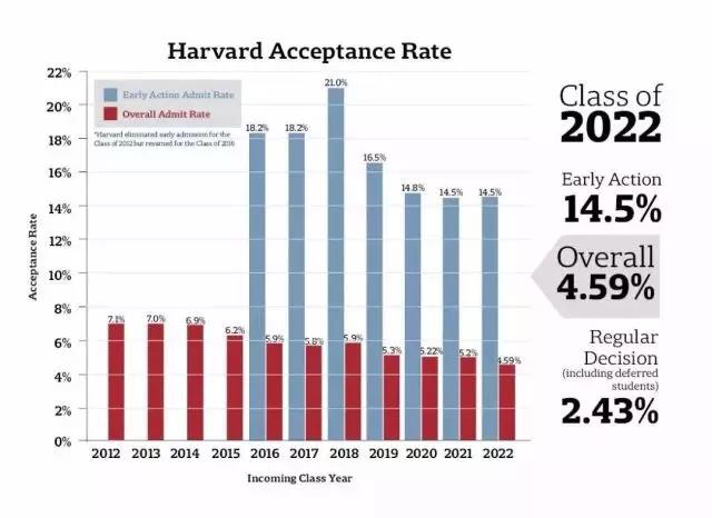 哈佛:录取率四年连降,今年首次跌破5%,造就了史上录取率最低记录4.5%;而且是藤校中录取率最低的。