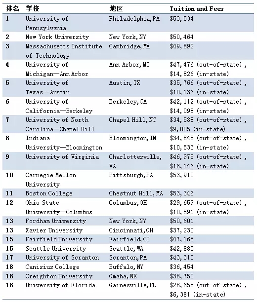 2018年USNews美国最佳本科金融专业排名