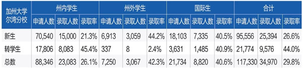 2018年UCB录取人数为13582,2019年,一共有14657名学生被录取,虽然相比去年有所回升,但是录取率还是很低。其中国际生申请共有17,037名,但被录取的却只有1,561人,可以说少到可怜了。