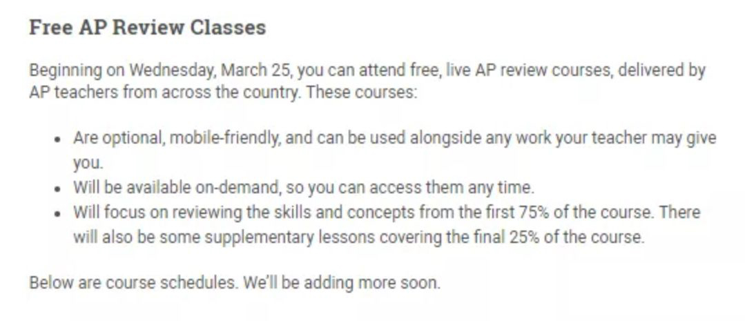 另外,从3月25日(星期三)开始,AP考生就可以学习免费的实时AP复习课程。具体每个科目的考试信息官方也在持续更新中。