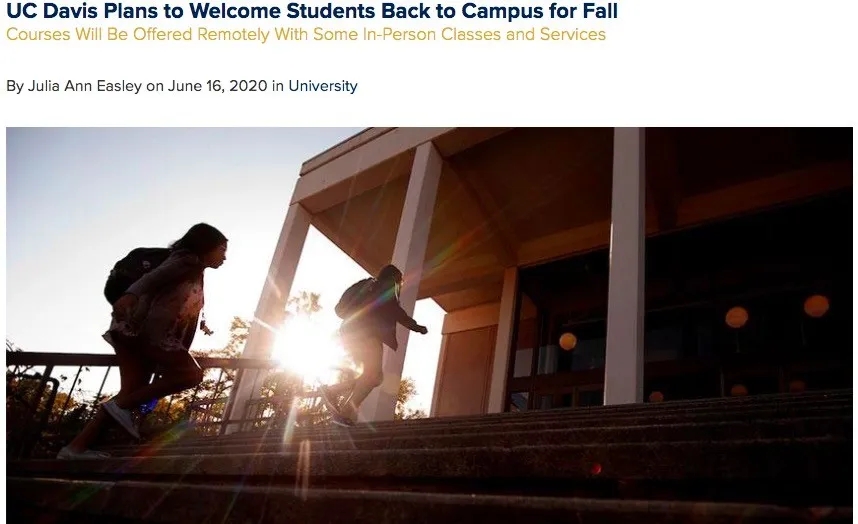 6月16日,加州大学戴维斯分校官宣:学校将于9月30日开始秋季教学。并且计划以远程模式提供绝大多数课程,但是那些无法进行远程教学的课程,如现场表演类和动手实践类课程将以面对面的形式进行教授。