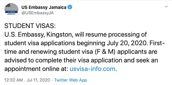 其实最近的种种动静也应证了这一情况。此前,美国驻牙买加大使馆已经正式官宣:7月20日开始重启学生签证业务!