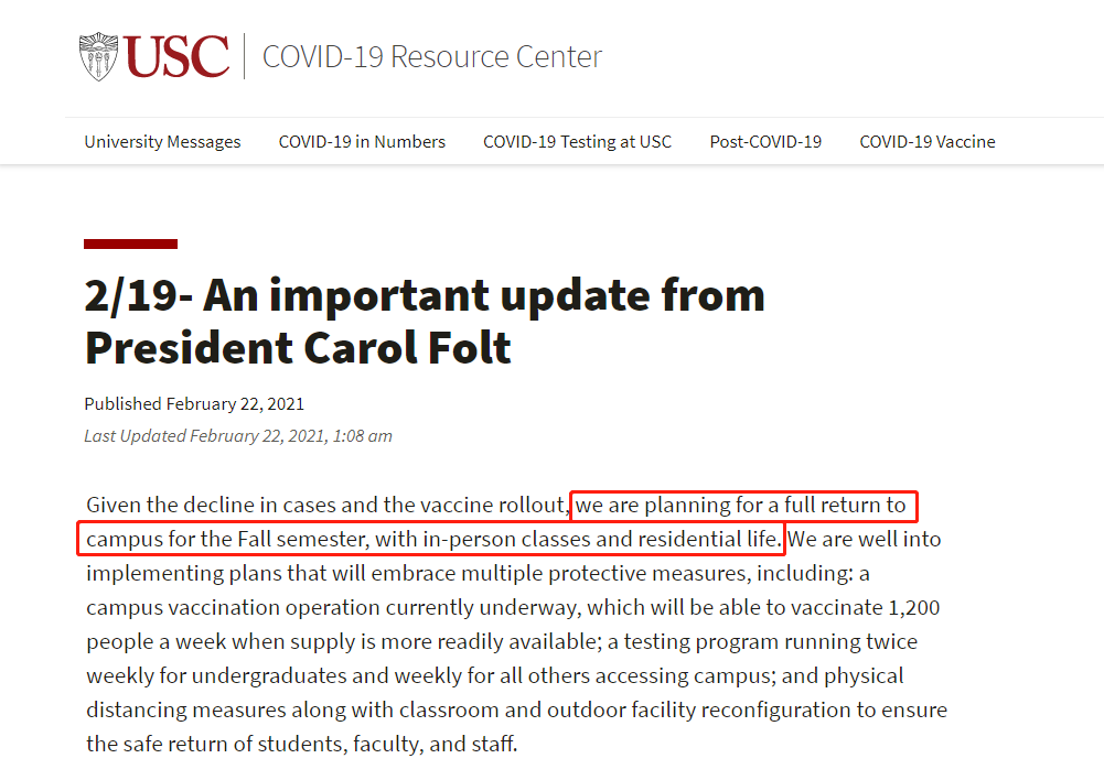 早在2月19日,UCS的校长Carol Folt就在给学生发送的邮件中宣布:随着疫情得到控制,学校计划将在2021年秋季学期全面恢复校园活动,并向学生提供线下课程和住宿。
