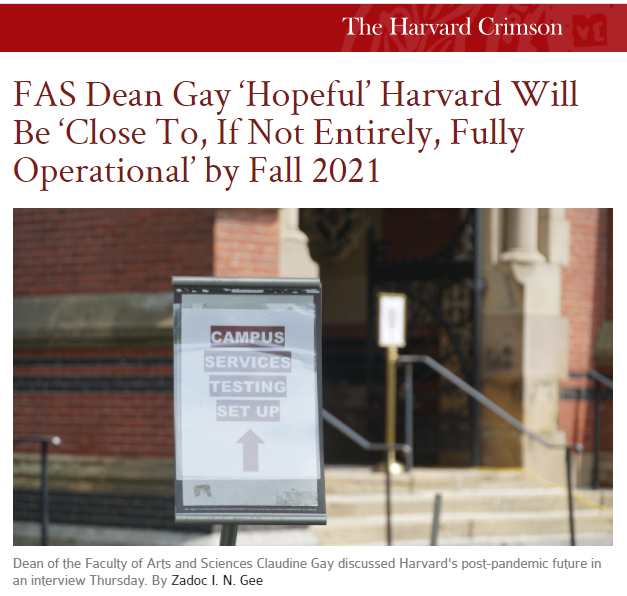 不仅如此,预言线下授课的还有我们TOP名校哈佛大学。其实早在几个月前,哈佛大学的文理学院院长Claudine Gay就曾在官网表态,“希望”能够在2021年秋季部分甚至全面恢复正常教学运行。