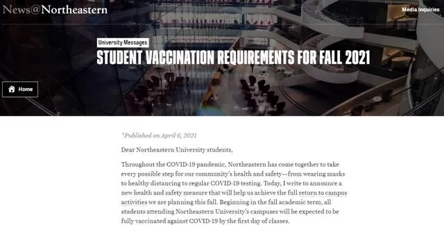东北大学要求2021年秋季重返东北大学校园的所有学生都将在上课的第一天完成疫苗接种。