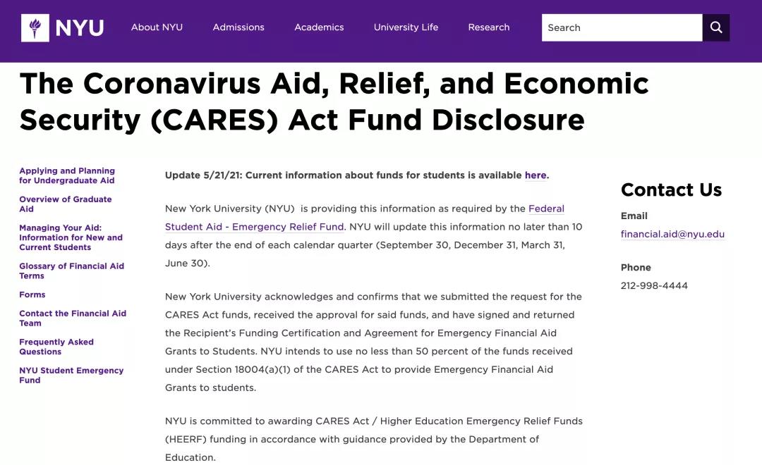 纽约大学已经提交了《CARES法案》资金的申请并收到了资金批准,纽约大学将根据《CARES法案》的要求将所收到资金的不少于50%的部分用于向学生提供紧急财政援助赠款。纽约大学会按照联邦学生援助紧急救济基金(Federal Student Aid - Emergency Relief Fund)的要求提供资金发放信息,并将在每个日历季度(9月30日,12月31日,3月31日,6月30日)结束后不晚于10天内更新相关信息。