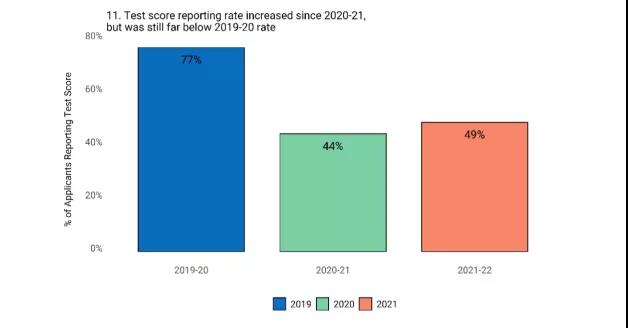 今年的数据继续反弹,可能是因为相比于之前的新冠流行情况,学生参加考试的机会增加了,但也可能反映出申请人的策略发生了变化,因为他们更多地认识到在申请竞争中,提交考试成绩将更加具备竞争力。