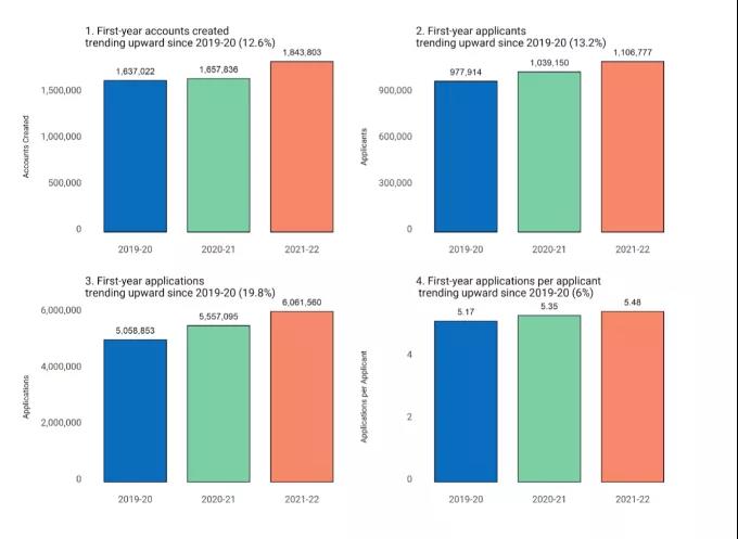 Common App从申请人创建的账户数量、申请人数、申请数量、每人申请数量几个维度进行对比。