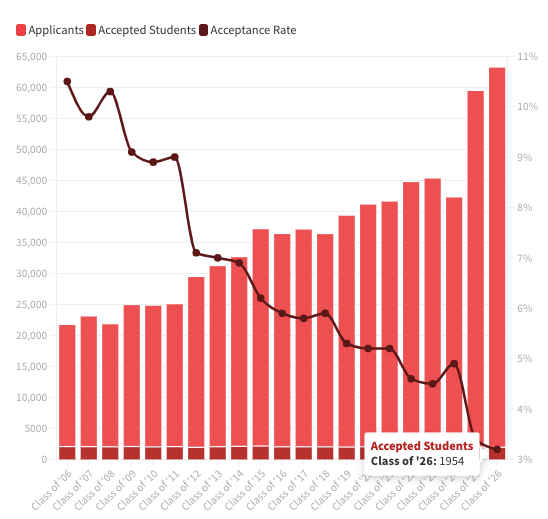2026届收到50002份申请,录取3085人,整体录取率为6.2%。其中早申阶段收到申请4015份,录取855人,录取率为21.3%;RD阶段收到申请45941份,录取2,120人,录取率为4.6%。
