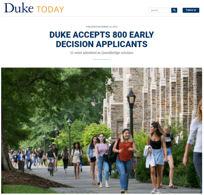 今年,杜克大学有 4,855 名 Early Decision 申请者,是杜克大学历史上第二高的申请人数。