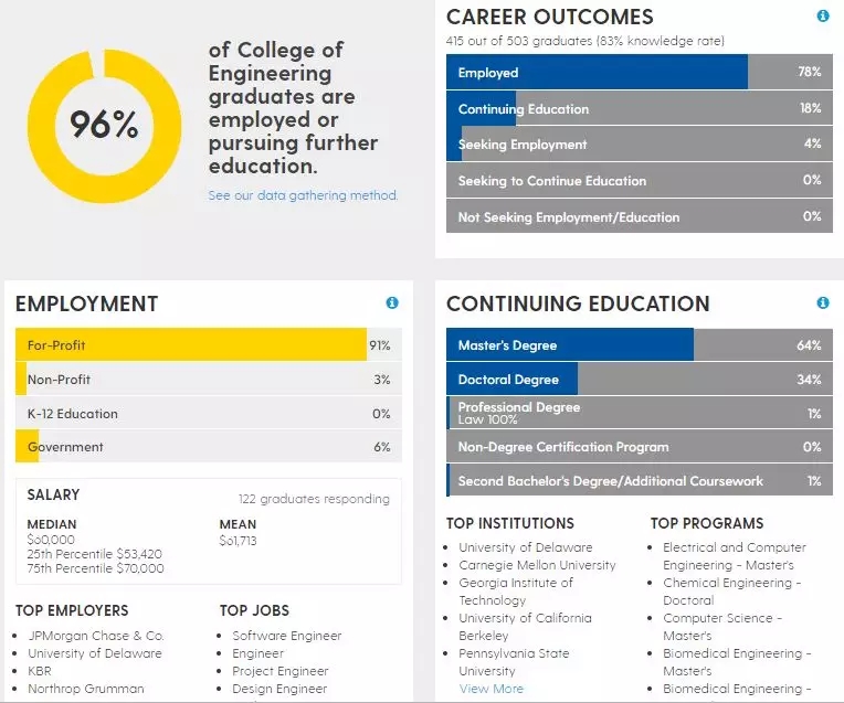 根据特拉华大学官方数据显示,2017年工程学院的就业与升读率高达96%。