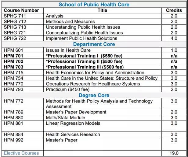 两年制项目细分专业领域有生物统计学、环境卫生科学、流行病学、卫生政策与管理、人口与家庭卫生、社会医学科学。申请者可以拥有不同的本科或研究生专业背景,如社会科学、人文科学、商学、理学和临床项目。一般不要求工作经验,但某些方向除外,如卫生服务管理和人口与家庭卫生分别要求5年和2年以上工作经验。